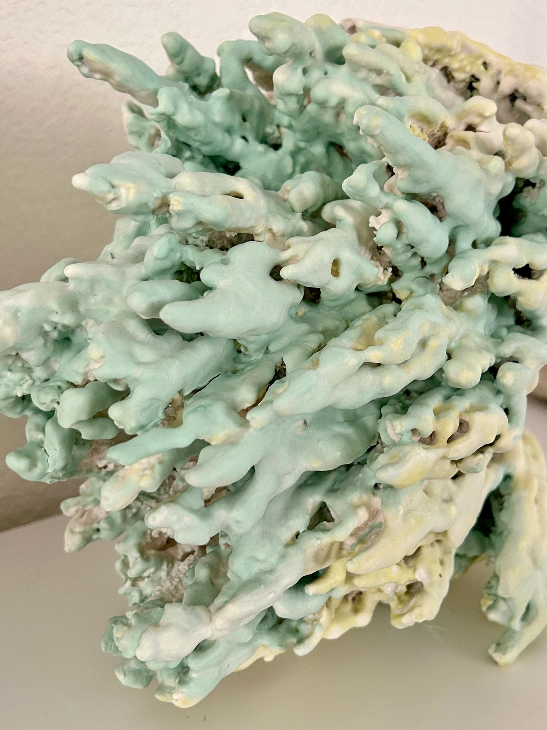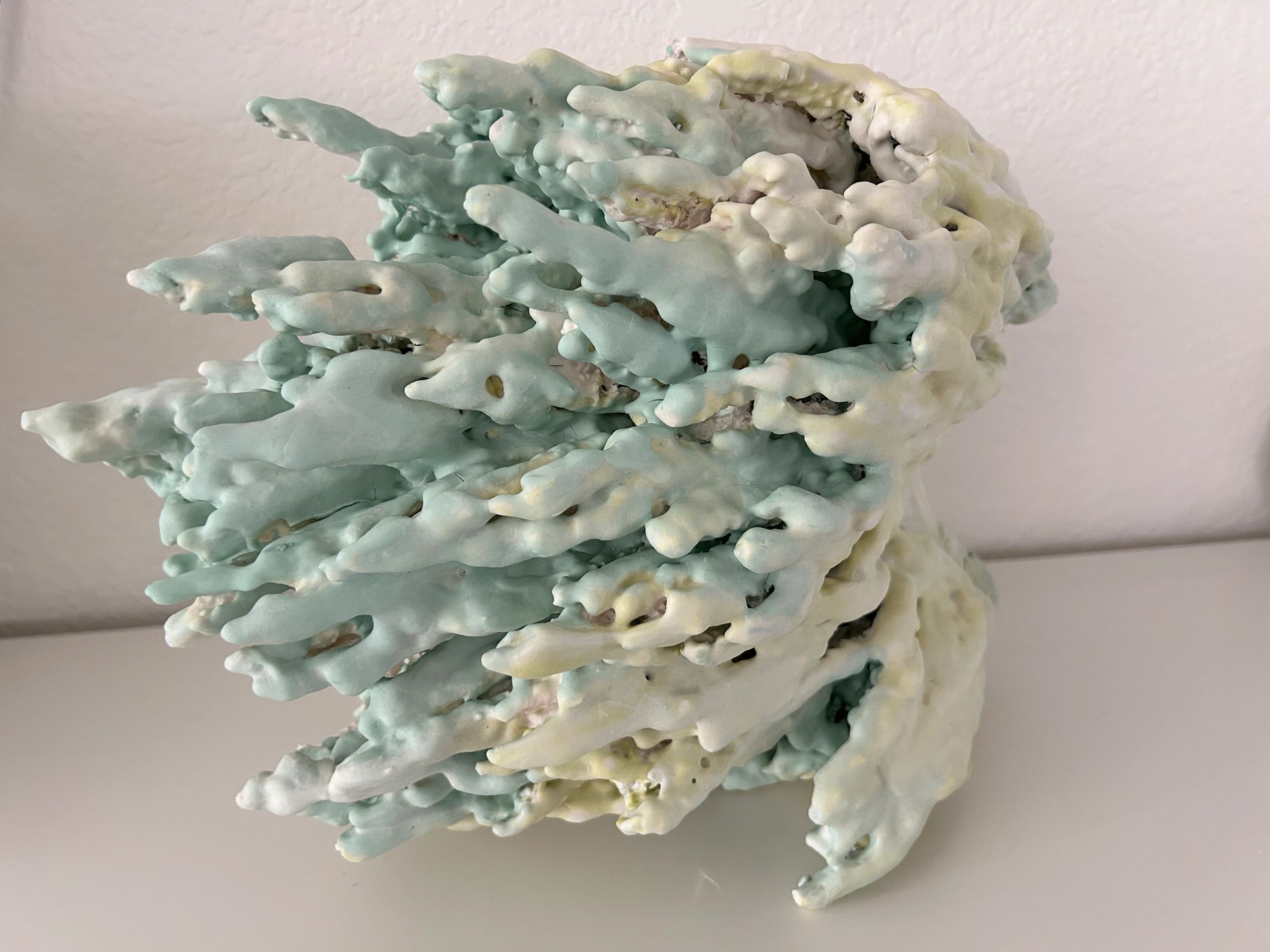 My work explores the possibility of existence within a dead sea—the persistence of life, movement, and transformation in environments defined by stillness. Living in the desert, where an ancient ocean once covered the land, I regard this landscape as a silent geological archive—a record of forms that have endured, eroded, and resurfaced through time. My practice emerges from that continuum of memory and metamorphosis. Each sculpture begins as a soft assemblage of fabric, yarn, or discarded textile, built intuitively by hand. Over time, I brush layer upon layer of porcelain slip onto the surface, allowing the material to gradually saturate and harden the form. Pigments are added between layers, creating subtle tonal shifts that suggest sedimentary accumulation. When the work is fired, the original structure burns away, leaving a translucent porcelain remnant—a relic and a record. These forms exist between the organic and the mineral, the living and the fossilized. They serve as meditations on endurance, loss, and renewal—reminders that even within desolation, transformation continues to unfold. In addition to porcelain’s inherent translucency, my sculptural works often incorporate LEDs, fiber optics, and internal lighting systems. These elements activate the ceramic surface from within, revealing subtle gradients of color and texture while transforming the works into quiet studies of radiance and shadow. Through light, I extend my inquiry into presence and perception—inviting viewers to see how illumination can act as both material and metaphor for endurance, memory, and transformation.